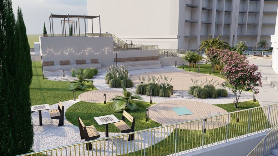 Спортивные и досуговые площадки предусмотрены и на свежем воздухе, и внутри здания. Тренируйтесь в воркаут-зоне, занимайтесь йогой или играйте в мини-хоккей и настольный теннис, не покидая территории комплекса.